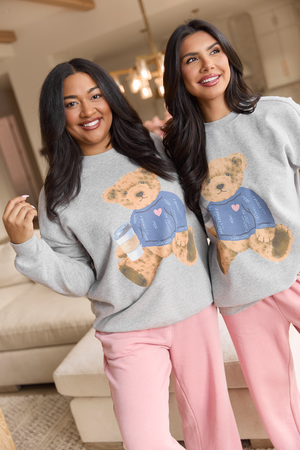 • Light grey crewneck with teddy bear design