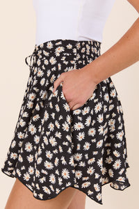 Cinched Waist Black Floral Print Skort