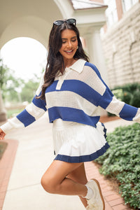 Zebb Long Sleeve Navy Blue Striped Open Knit Sweater FINAL SALE